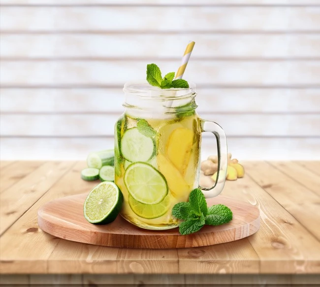 - 3 Gurkenscheiben, 2-3 Scheiben Limette, 3 Scheiben Ingwer und Minzblätter für die Garnitur vorbereiten.