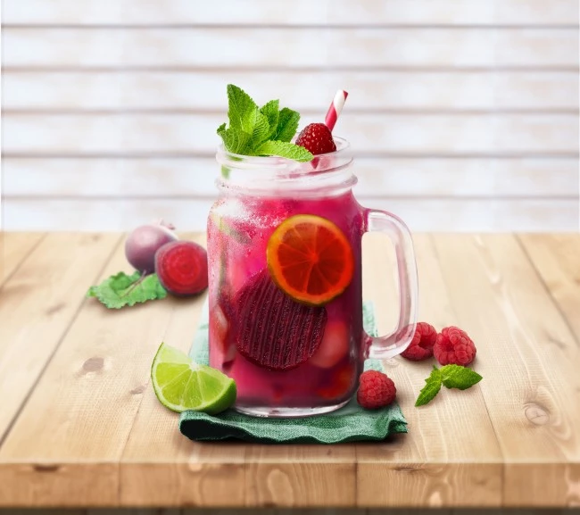- 2 Scheiben Rote Bete, 2-3 Scheiben Limette, 3-4 Himbeeren und Minzblätter für die Garnitur vorbereiten.